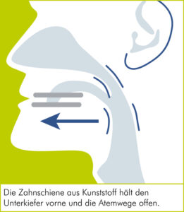Die einfache und schnelle LösungDurch das Tragen einer Kunststoffschiene während des Schlafens wird der Unterkiefer vorn und somit der Atemweg frei gehalten.